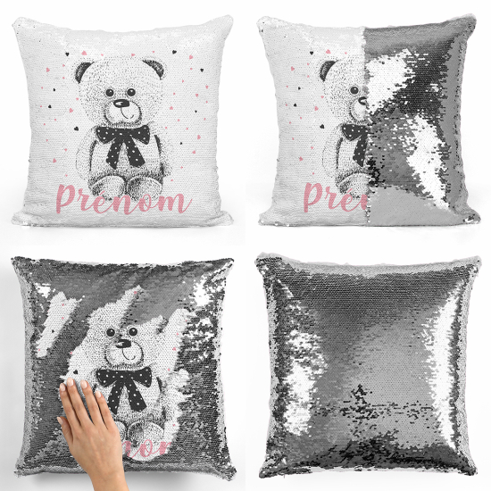 Coussin sequins personnalisé - Ourson coeurs