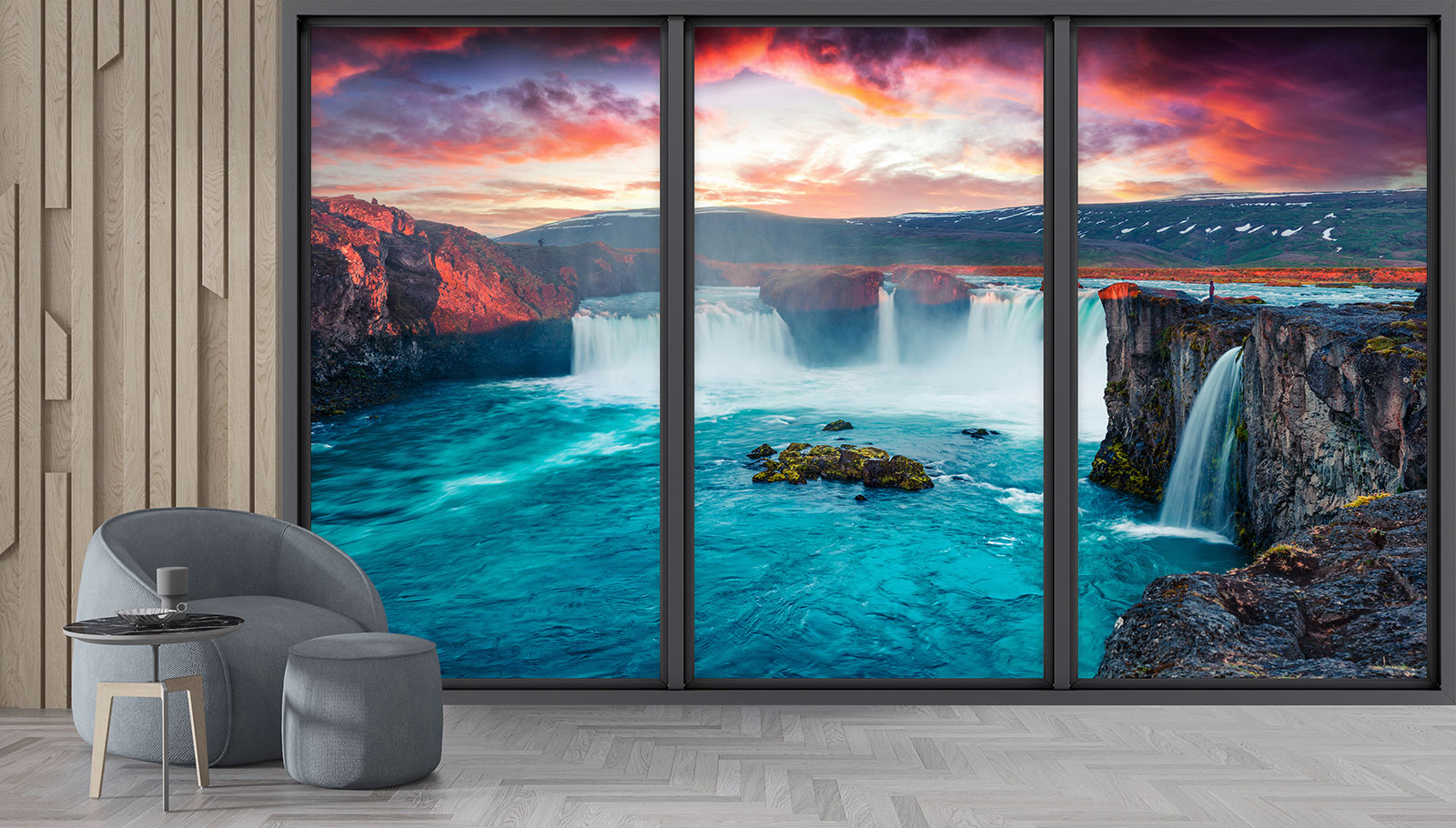 www.lumalea.fr > Papiers Peints > > > Papiers Peints Trompe L'oeil > Baies vitrées Trompe-l'œil > Papier peint panoramique Trompe l'œil baie vitrée - Cascades