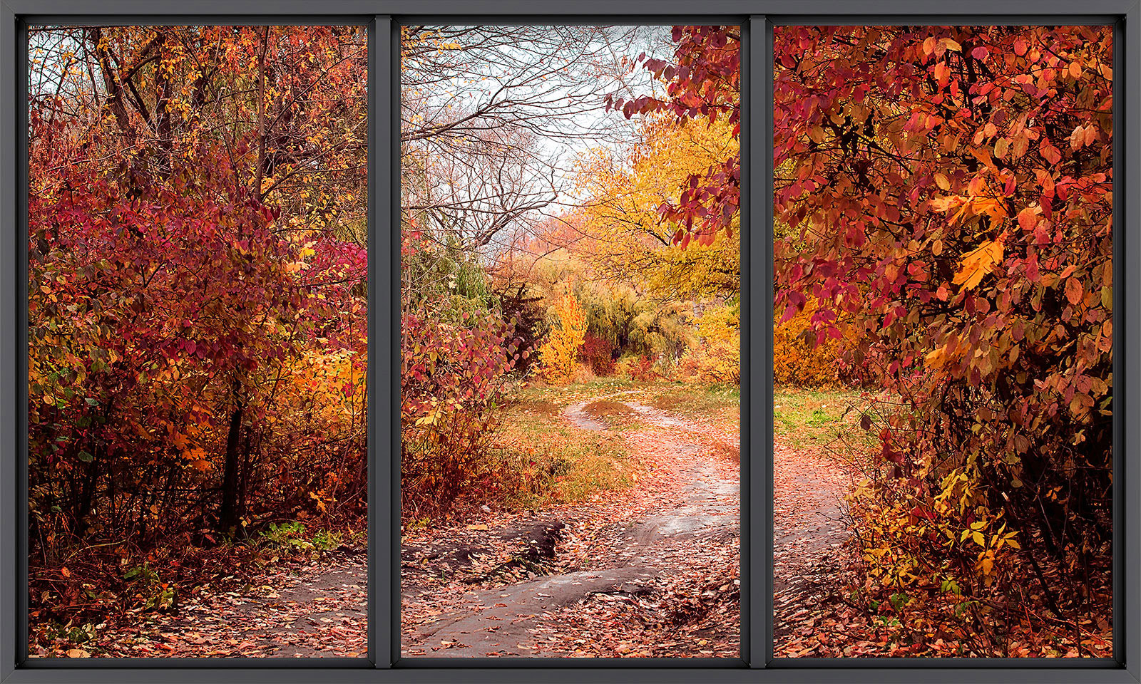 www.lumalea.fr > Papiers Peints > > > Papiers Peints Trompe L'oeil > Baies vitrées Trompe-l'œil > Papier peint panoramique Trompe l'œil baie vitrée - Chemin forêt