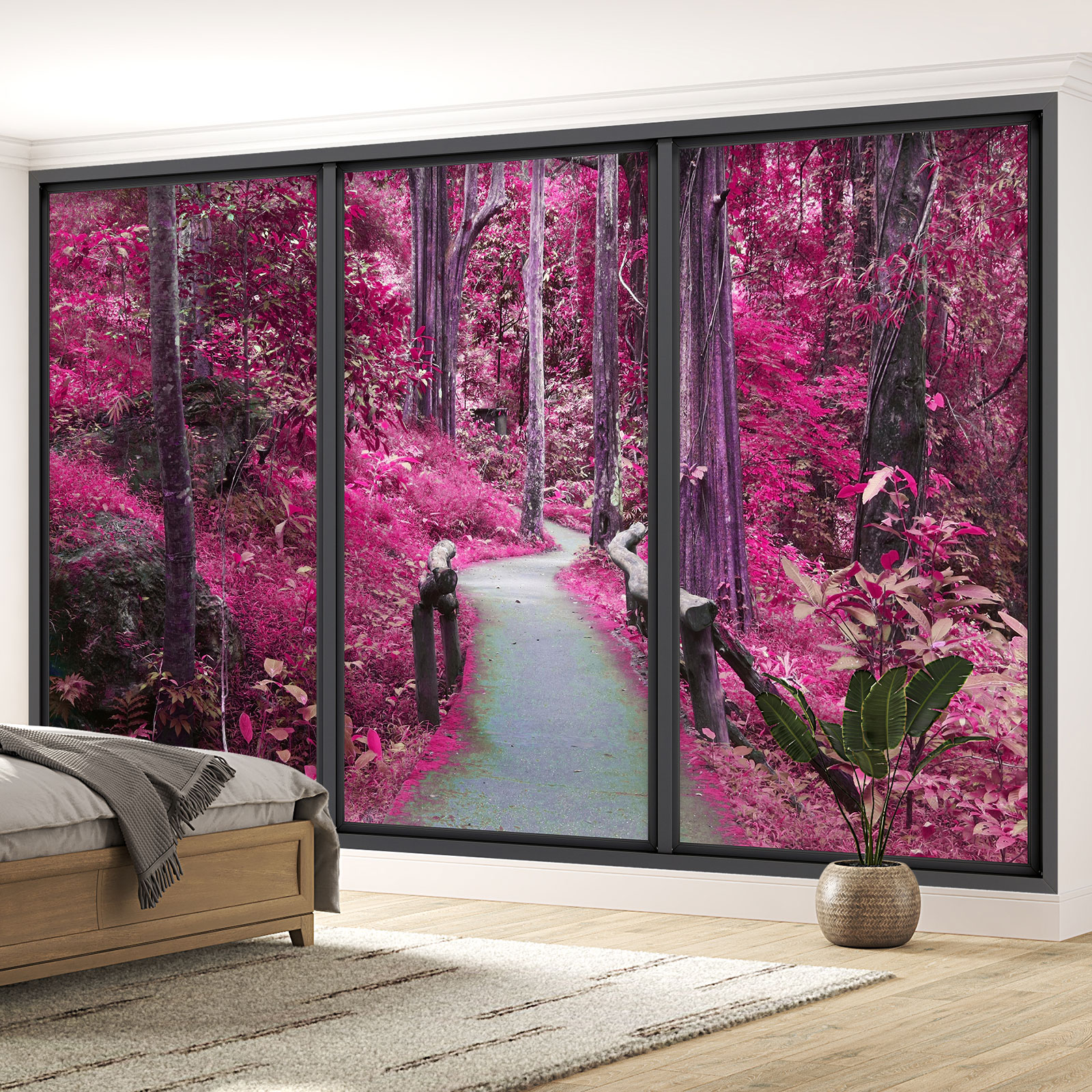 www.lumalea.fr > Papiers Peints > > > Papiers Peints Trompe L'oeil > Baies vitrées Trompe-l'œil > Papier peint panoramique Trompe l'œil baie vitrée - Chemin forêt