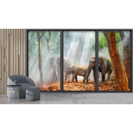 Papier peint panoramique Trompe l'œil baie vitrée - Éléphants