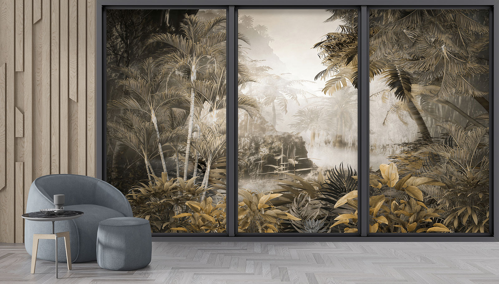 www.lumalea.fr > Papiers Peints > > > Papiers Peints Trompe L'oeil > Baies vitrées Trompe-l'œil > Papier peint panoramique Trompe l'œil baie vitrée - Jungle
