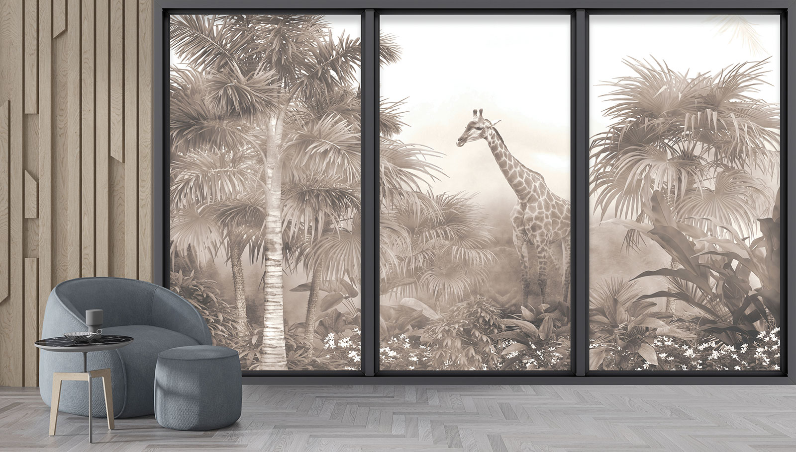 Papier peint panoramique Trompe l'œil baie vitrée - Jungle Girafe