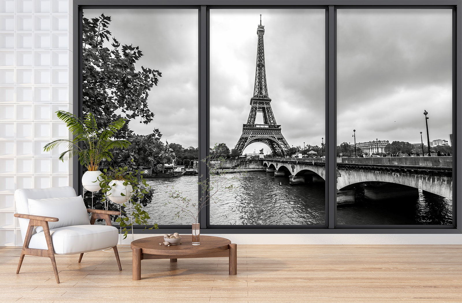 Papier peint panoramique Trompe l'œil baie vitrée - Paris tour eiffel