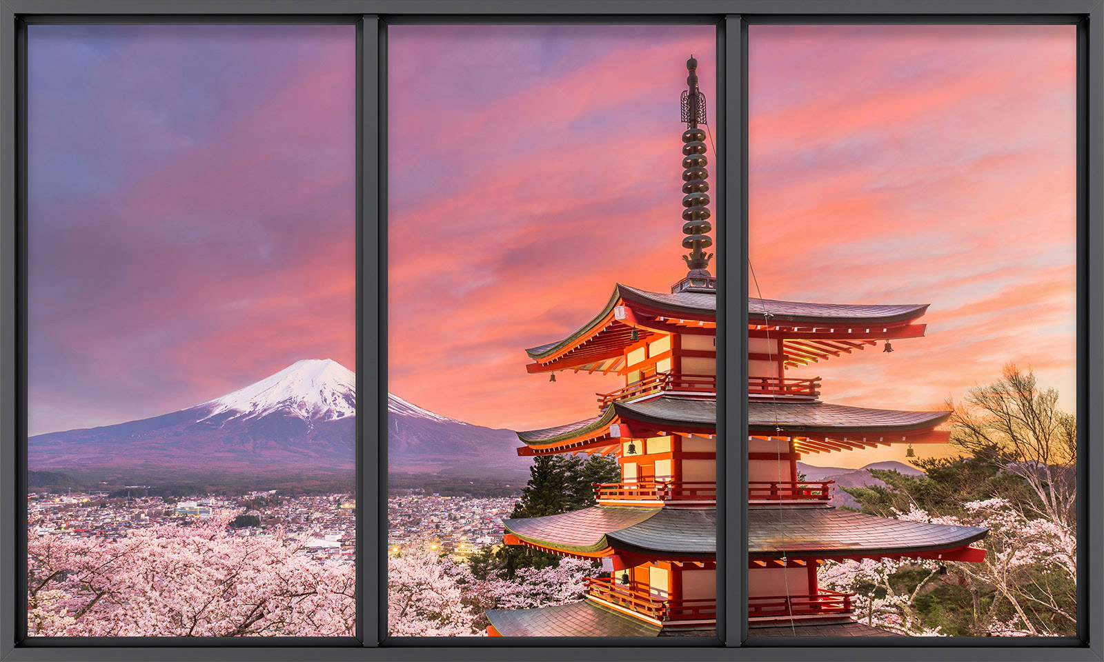 Papier peint panoramique Trompe l'œil baie vitrée - Temple japonais vue mont fujii