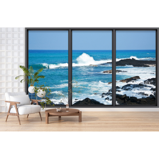 www.lumalea.fr > Papiers Peints > > > Papiers Peints Trompe L'oeil > Baies vitrées Trompe-l'œil > Papier peint panoramique Trompe l'œil baie vitrée - Vue mer