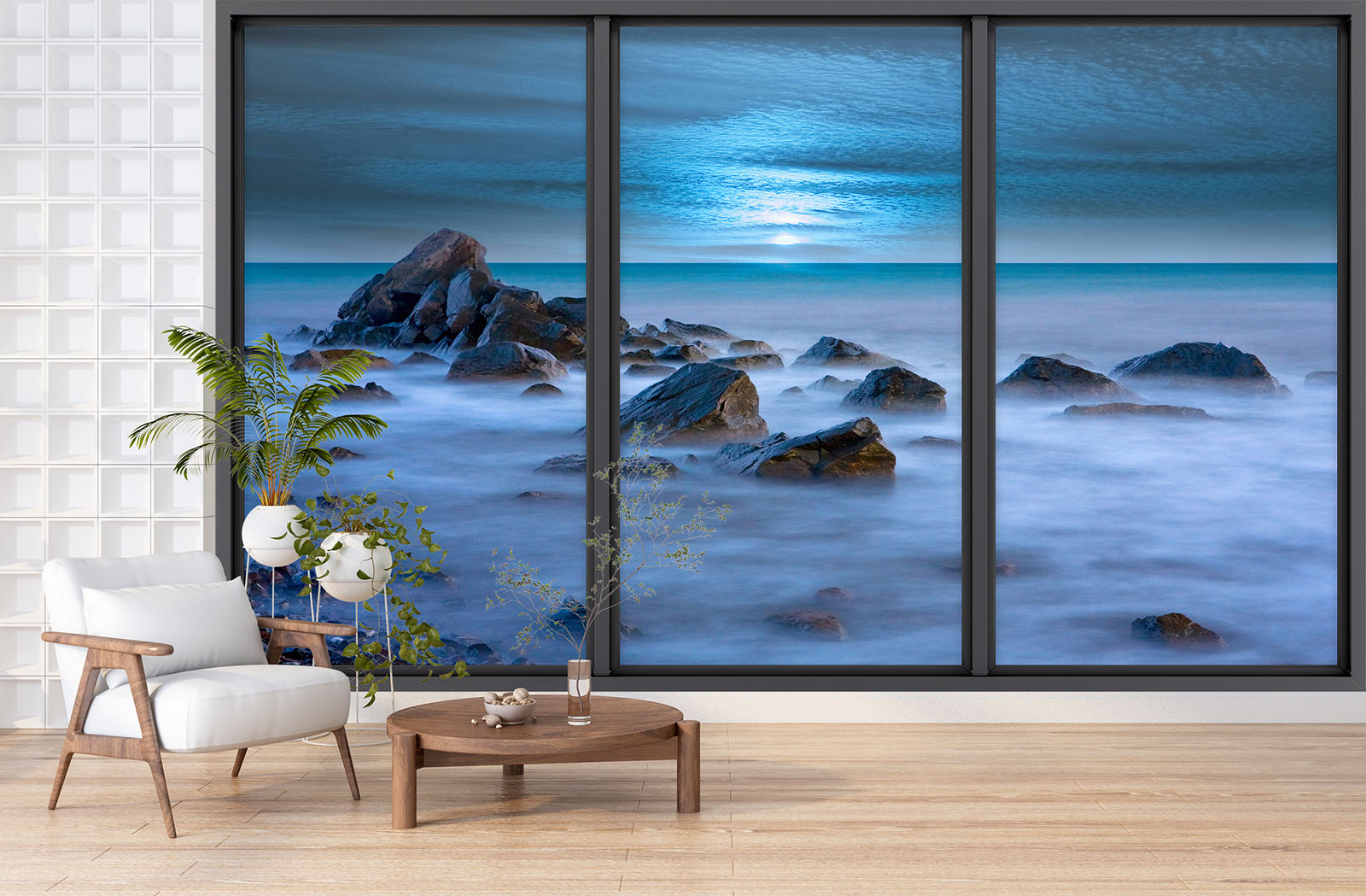 www.lumalea.fr > Papiers Peints > > > Papiers Peints Trompe L'oeil > Baies vitrées Trompe-l'œil > Papier peint panoramique Trompe l'œil baie vitrée - Vue mer