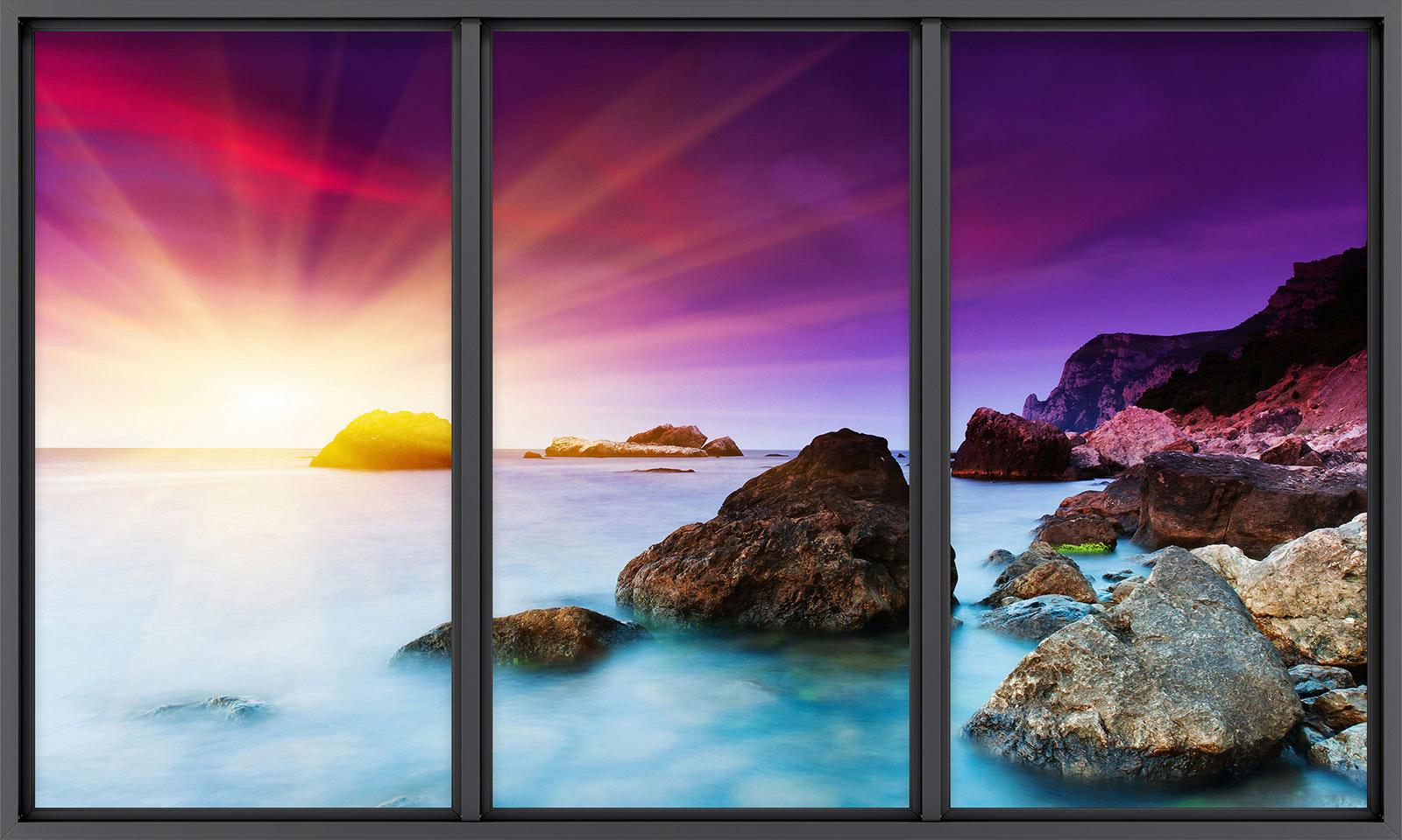 www.lumalea.fr > Papiers Peints > > > Papiers Peints Trompe L'oeil > Baies vitrées Trompe-l'œil > Papier peint panoramique Trompe l'œil baie vitrée - Vue mer