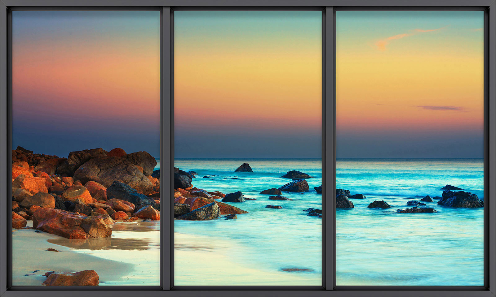 www.lumalea.fr > Papiers Peints > > > Papiers Peints Trompe L'oeil > Baies vitrées Trompe-l'œil > Papier peint panoramique Trompe l'œil baie vitrée - Vue mer