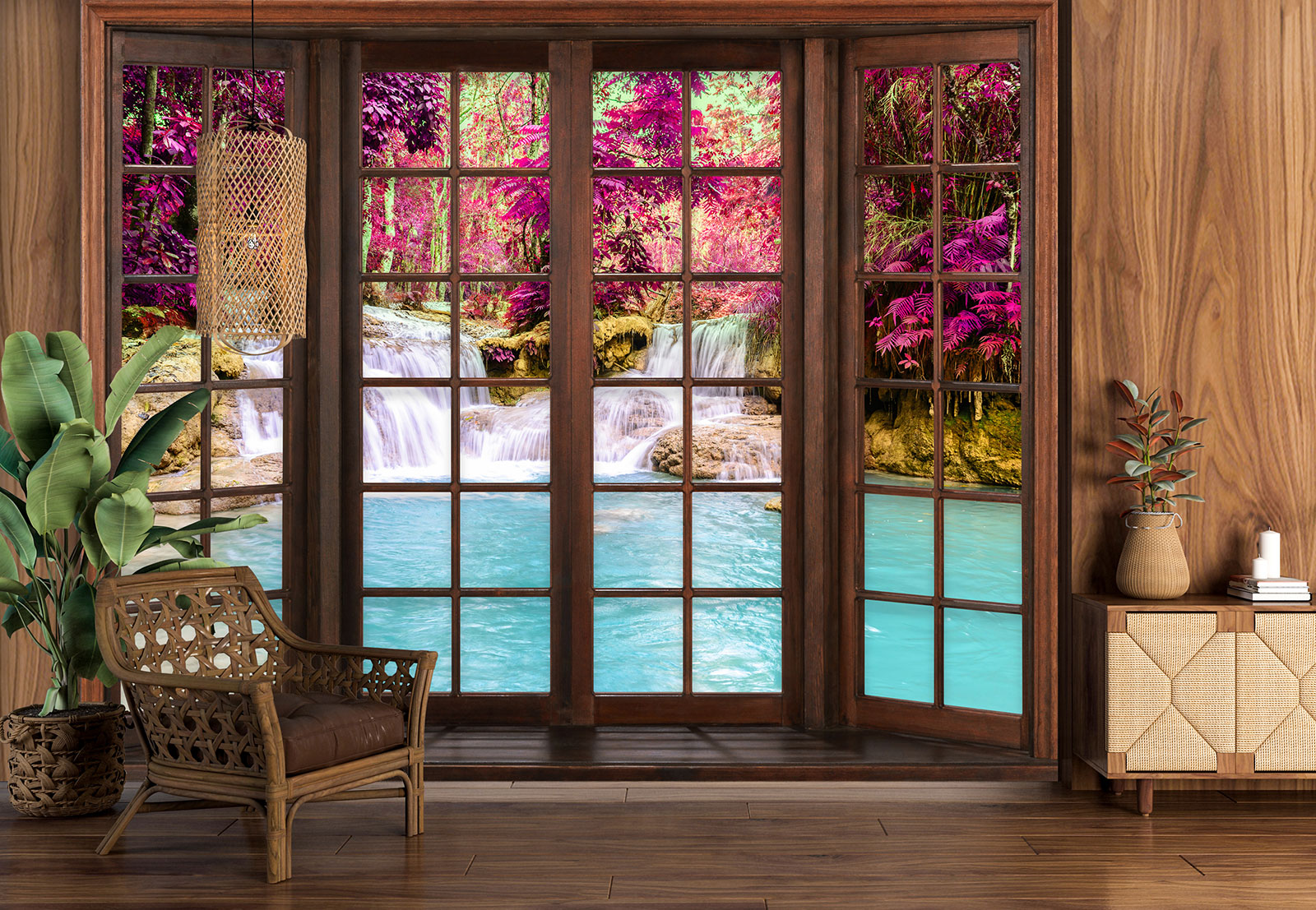 www.lumalea.fr > Papiers Peints > > > Papiers Peints Trompe L'oeil > Fenêtres Trompe-l'œil > Papier peint panoramique Trompe l'œil Fenêtre en bois - Cascades