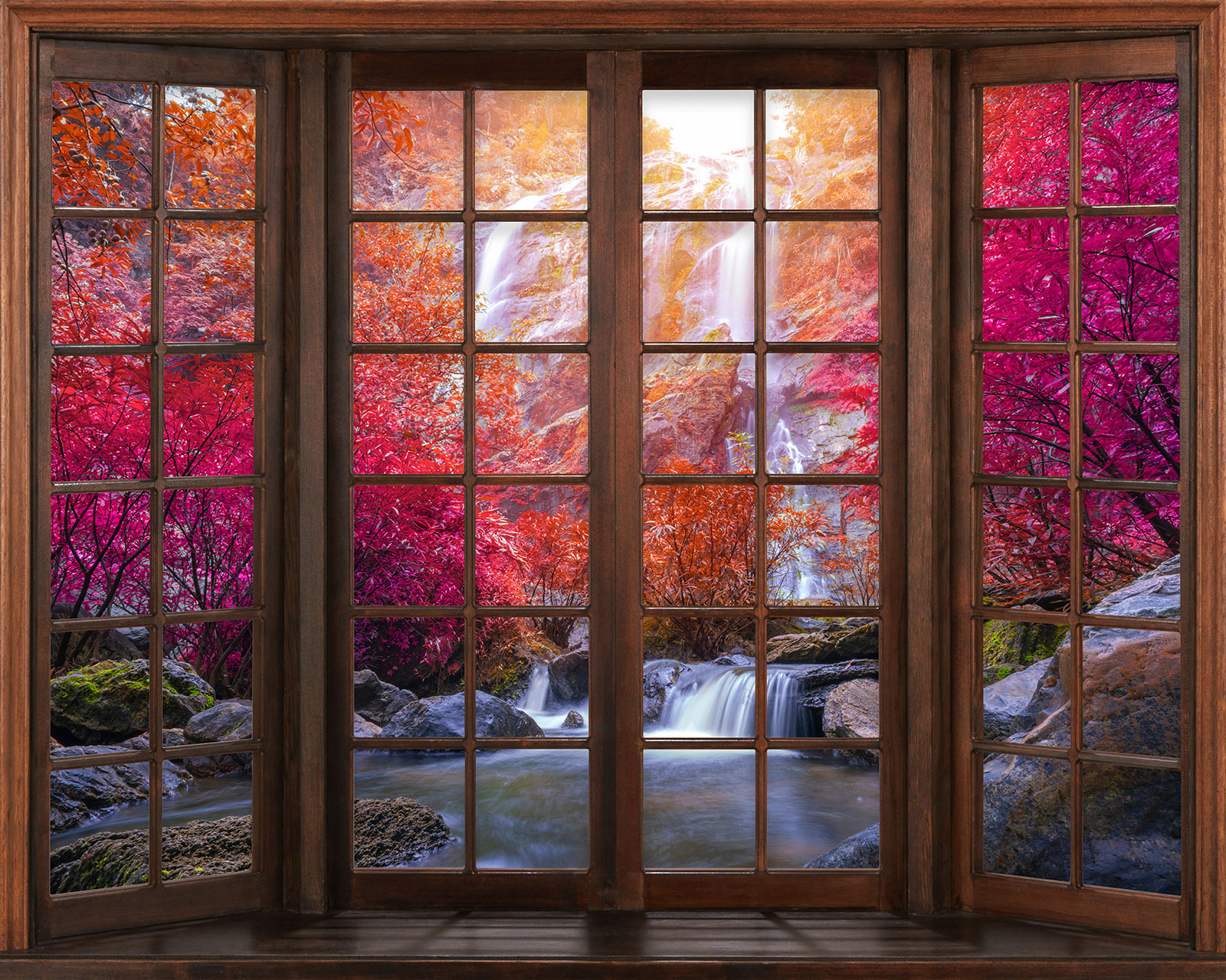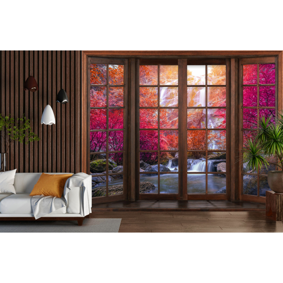 www.lumalea.fr > Papiers Peints > > > Papiers Peints Trompe L'oeil > Fenêtres Trompe-l'œil > Papier peint panoramique Trompe l'œil Fenêtre en bois - Cascades