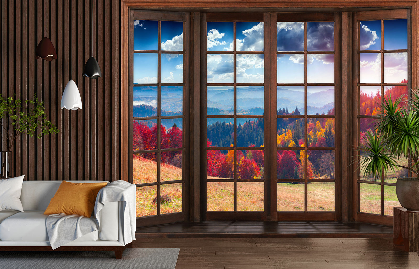 Papier peint panoramique Trompe l'œil Fenêtre en bois - Forêt automne