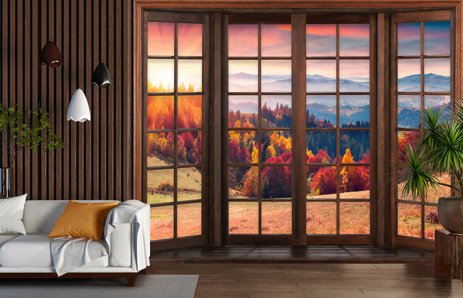 Papier peint panoramique Trompe l'œil Fenêtre en bois - Forêt automne