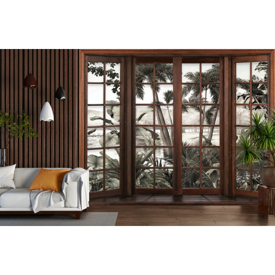 www.lumalea.fr > Papiers Peints > > > Papiers Peints Trompe L'oeil > Fenêtres Trompe-l'œil > Papier peint panoramique Trompe l'œil Fenêtre en bois - Forêt Tropicale