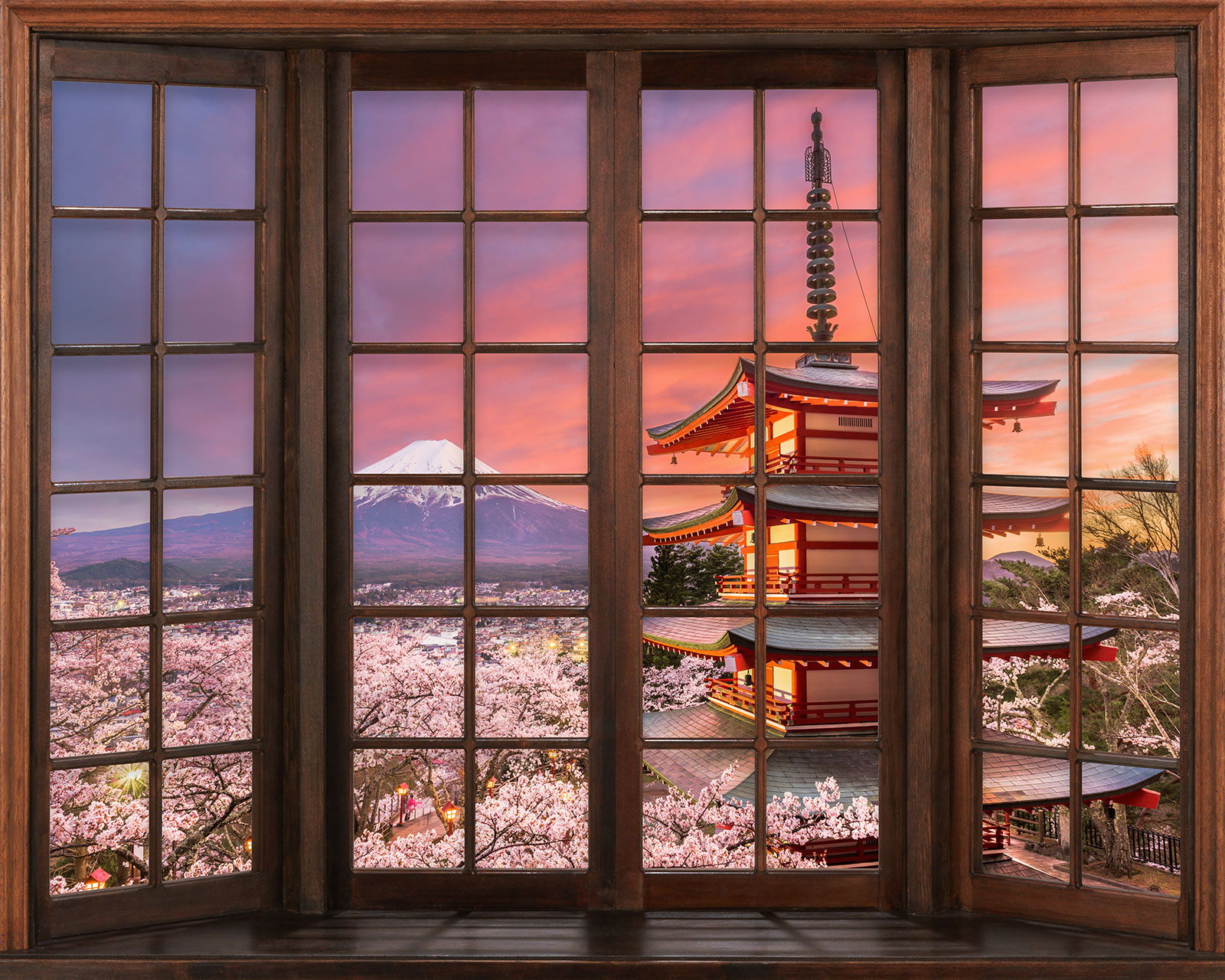 Papier peint panoramique Trompe l'œil Fenêtre en bois - Mont Fuji Japon