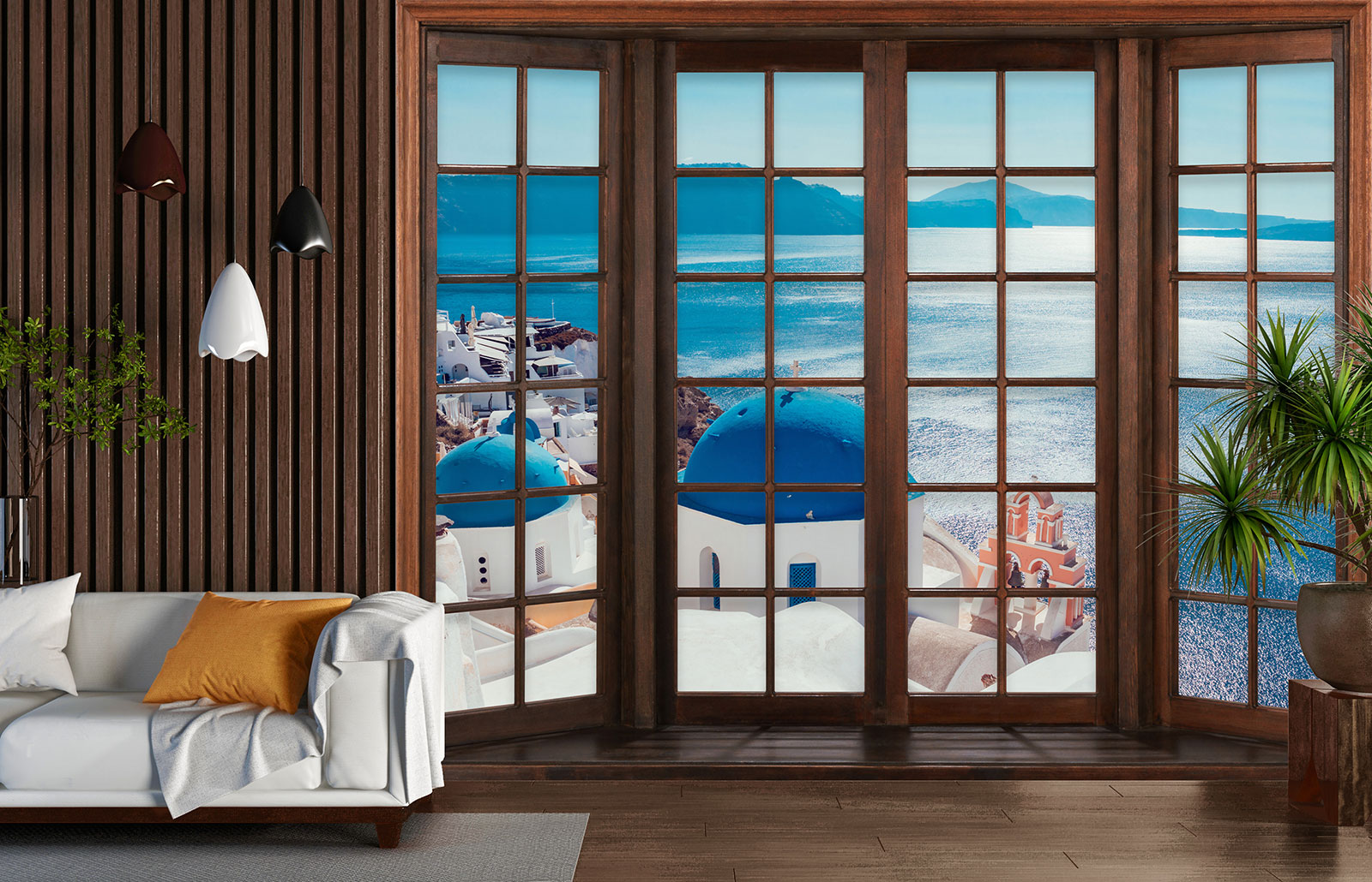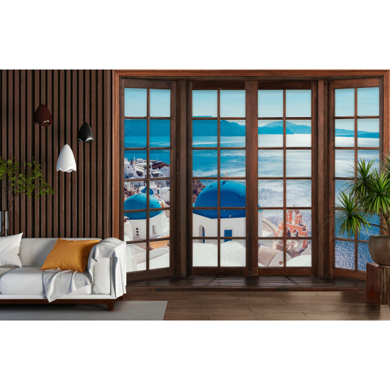 Papier peint panoramique Trompe l'œil Fenêtre en bois - Santorin