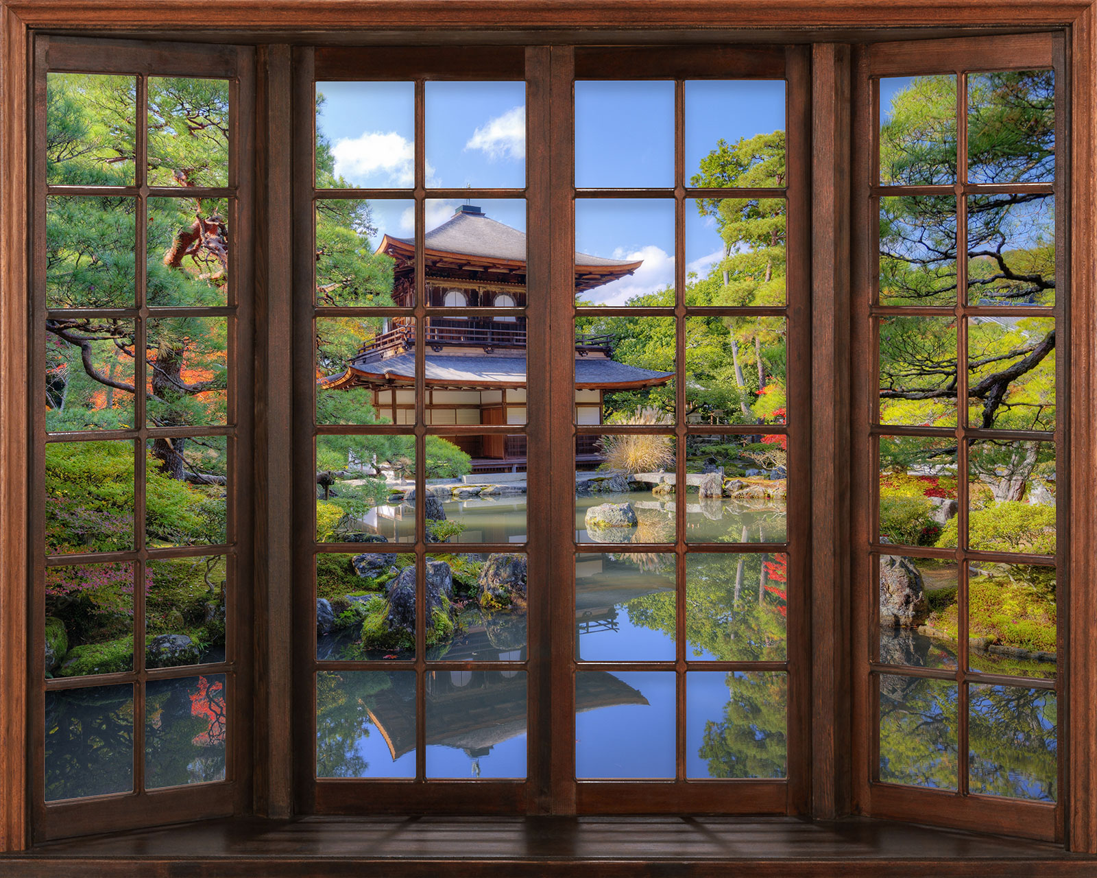 www.lumalea.fr > Papiers Peints > > > Papiers Peints Trompe L'oeil > Fenêtres Trompe-l'œil > Papier peint panoramique Trompe l'œil Fenêtre en bois - Temple Japonais
