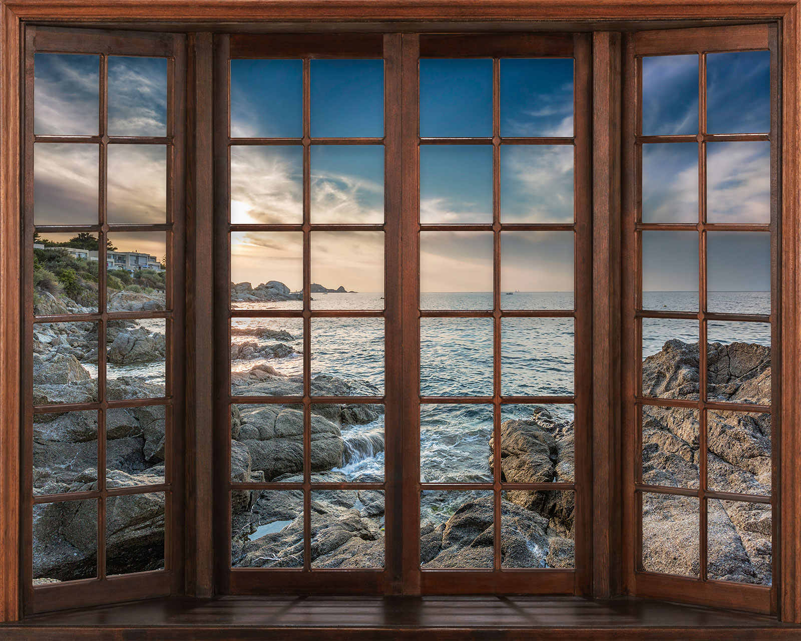 Papier peint panoramique Trompe l'œil Fenêtre en bois - Vue Mer