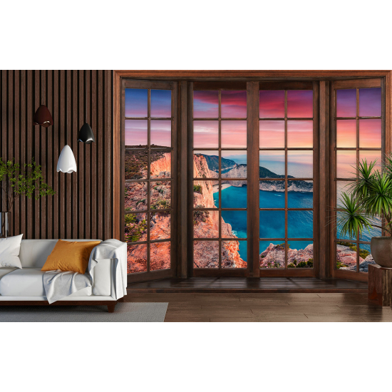 Papier peint panoramique Trompe l'œil Fenêtre en bois - Vue Mer