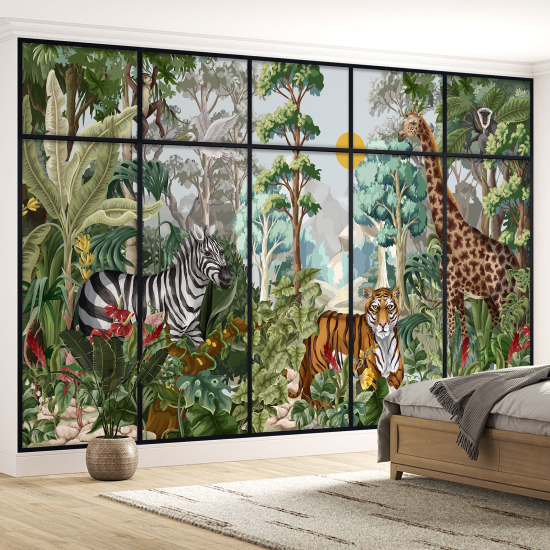 Papier peint panoramique Trompe l'œil Verrière Enfants - Animaux de la jungle