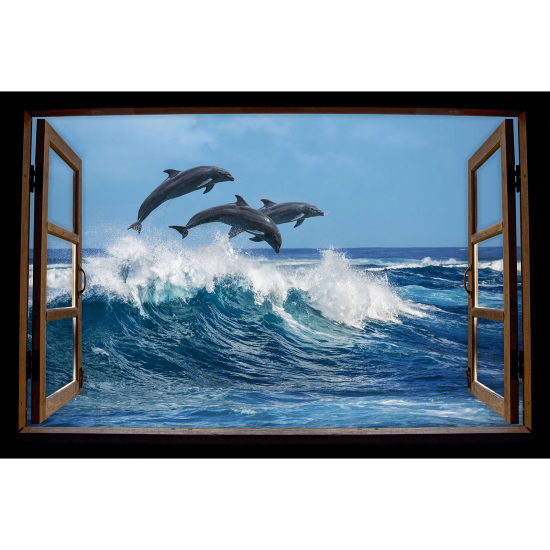www.lumalea.fr > Stickers > Stickers Trompe L'oeil > Stickers Fenêtres en Bois > Stickers Trompe l'œil fenêtre en bois - Dauphins