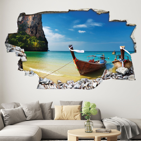 Stickers Trompe l'oeil trou dans le mur - Bateau sur la plage