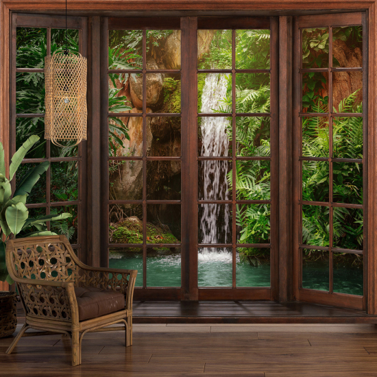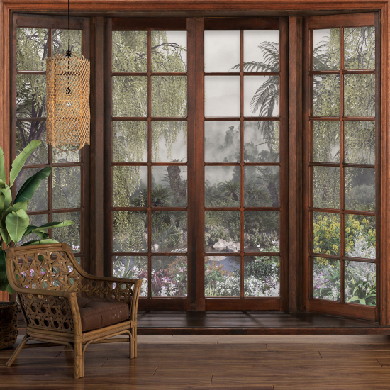 Papier peint panoramique Trompe l'œil Fenêtre en bois - Forêt Tropicale
