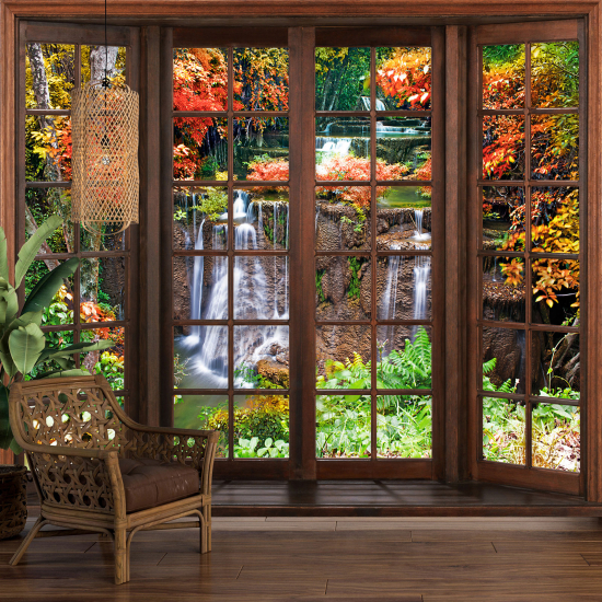 Papier peint panoramique Trompe l'œil Fenêtre en bois - Forêt automne
