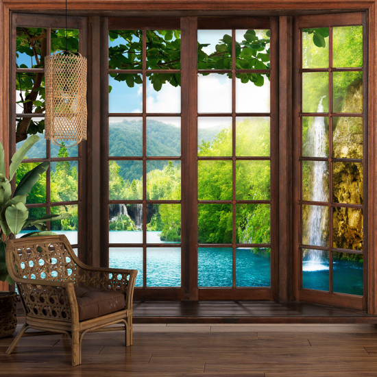 Papier peint panoramique Trompe l'œil Fenêtre en bois - Cascades