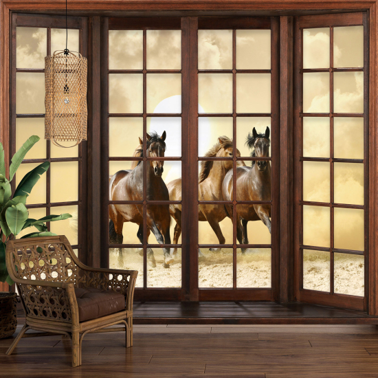 Papier peint panoramique Trompe l'œil Fenêtre en bois - Chevaux
