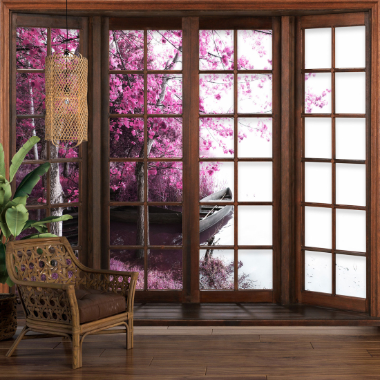 Papier peint panoramique Trompe l'œil Fenêtre en bois - Arbres feuilles rouges