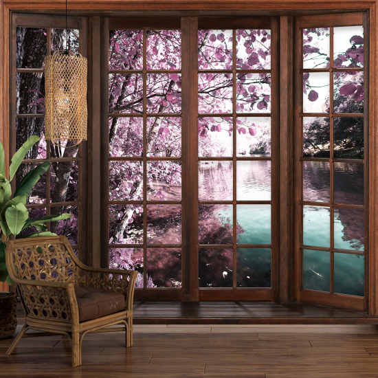 Papier peint panoramique Trompe l'œil Fenêtre en bois - Jardin Rivière
