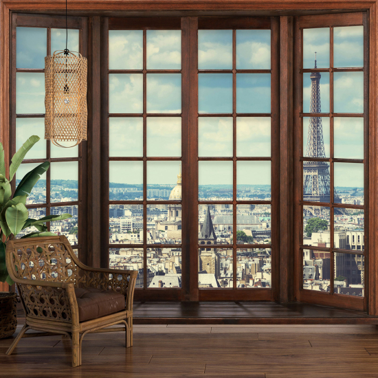 Papier peint panoramique Trompe l'œil Fenêtre en bois - Paris tour eiffel