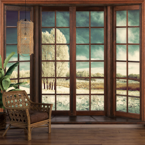 Papier peint panoramique Trompe l'œil Fenêtre en bois - Paysage hivernal