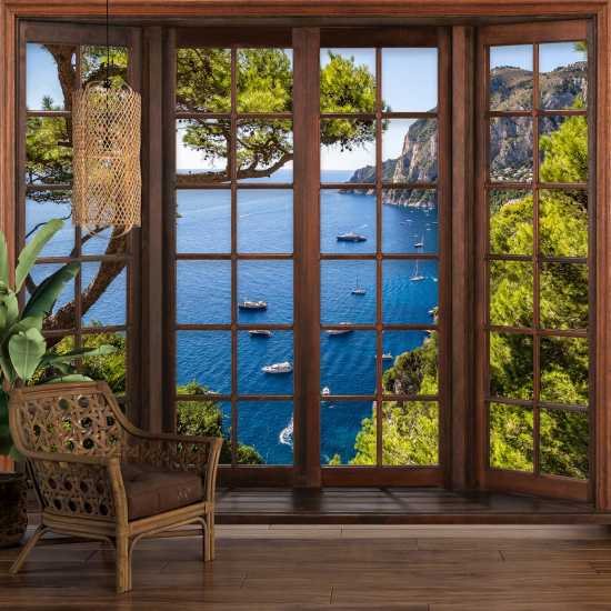 Papier peint panoramique Trompe l'œil Fenêtre en bois - Vue Mer